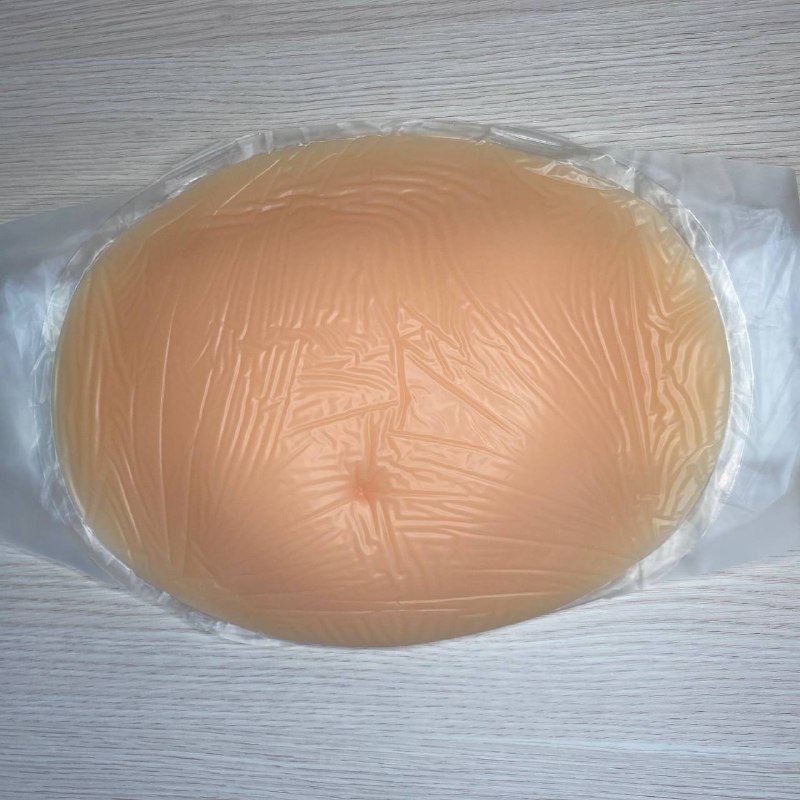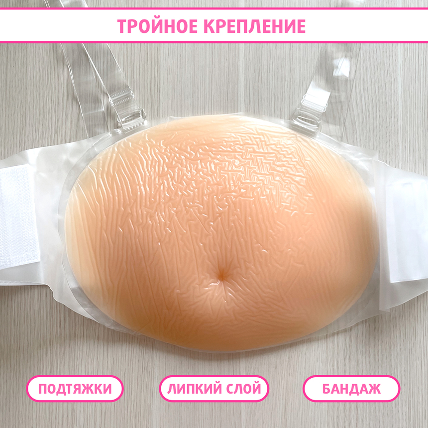 Накладной живот из силикона для имитации беременности на средних сроках беременности. Он имеет стандартное тройное крепление - клеевой слой/бандаж/бретели.