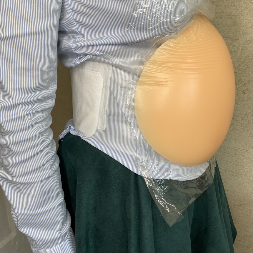 Накладной живот из силикона для имитации беременности на сроке 6 месяцев. Имеет стандартное тройное крепление- клеевой слой/бандаж/бретели.