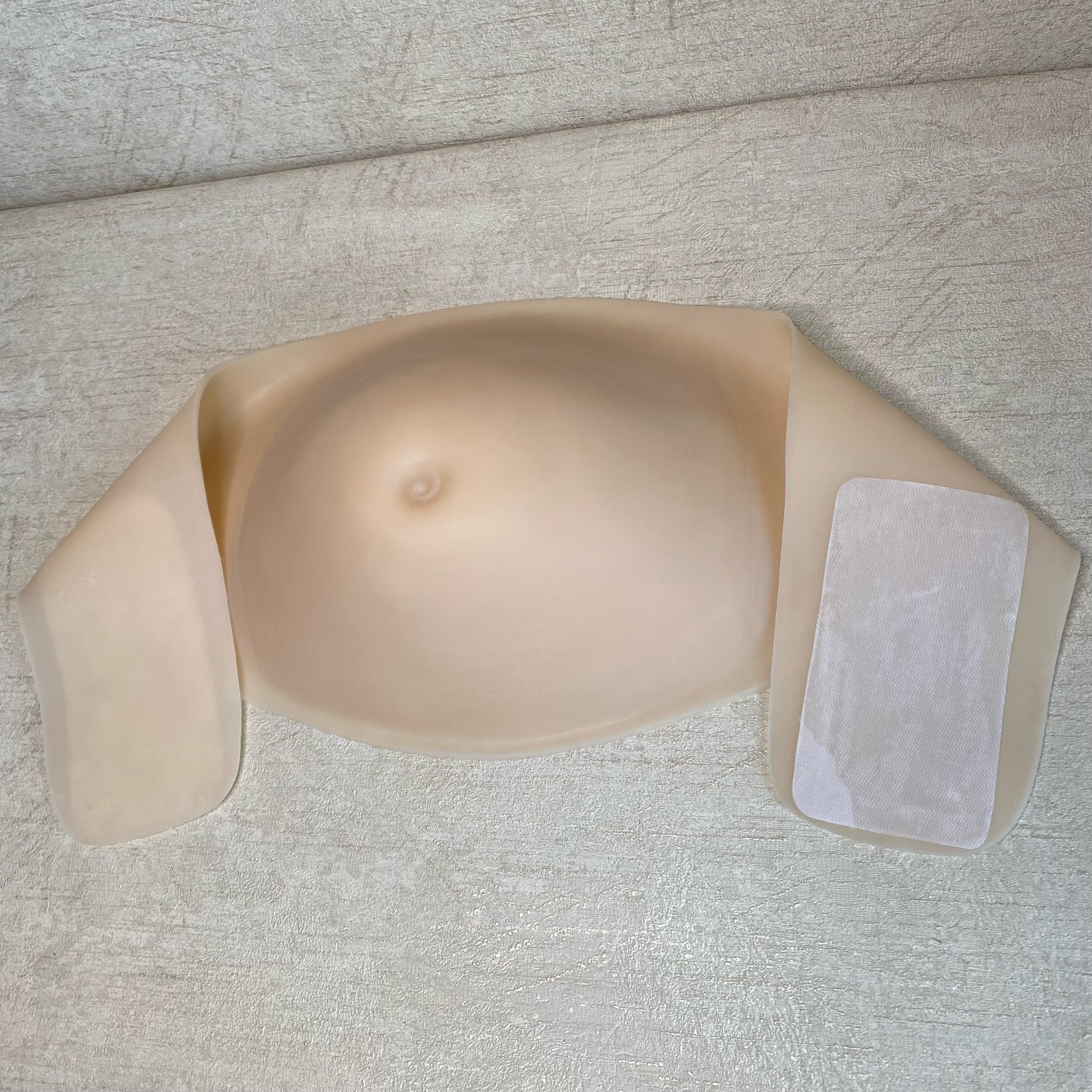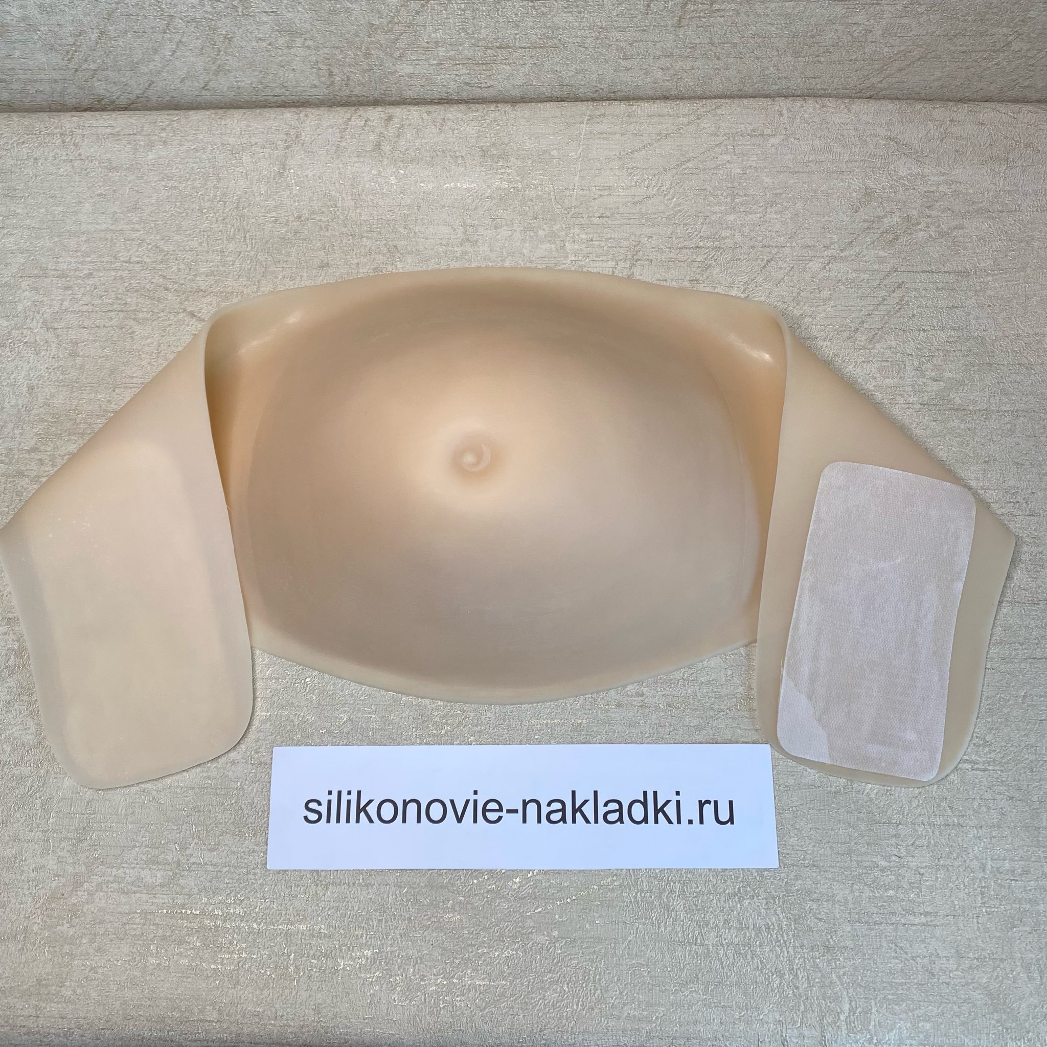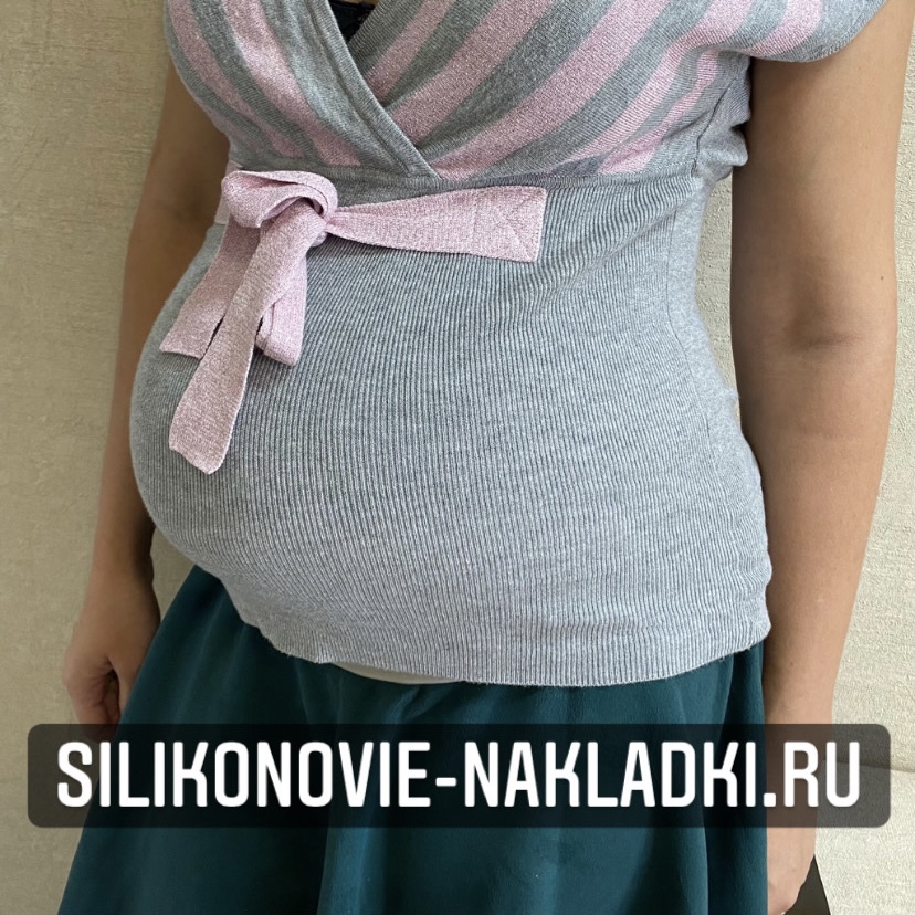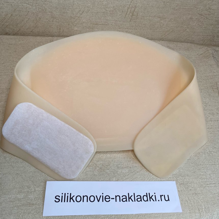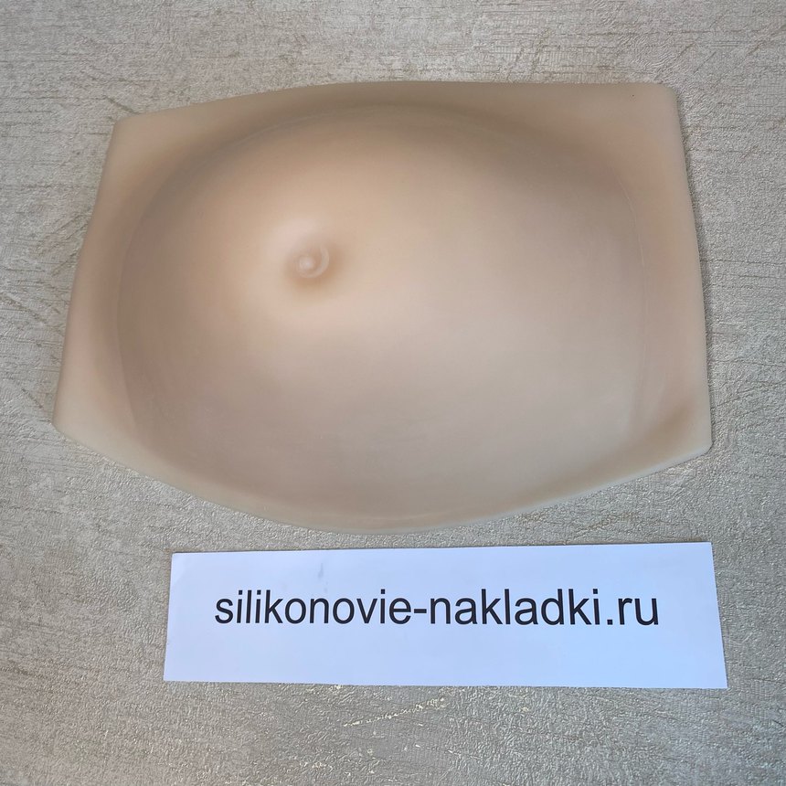 Накладной живот из силикона для имитации многоплодной беременности на 3-ем триместре. Имеет стандартное крепление - клеевой слой/бандаж.