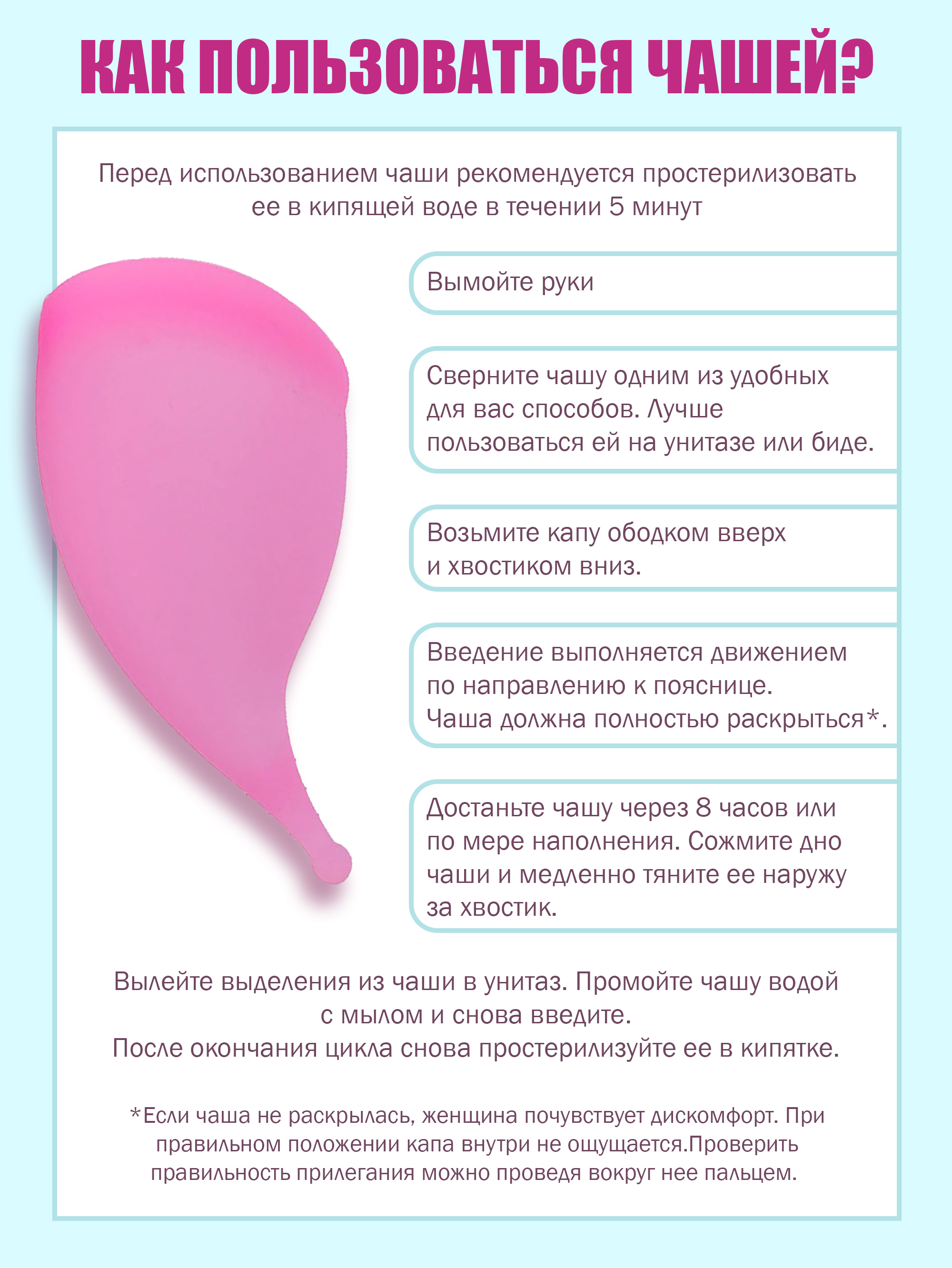 Менструальная чаша изготавливается из мягкого 100% силикона. Чаша очень удобна в использовании. Чашу необходимо свернуть несколько раз и поместить внутрь. Чаша раскроется и зафиксируется с помощью легкого вакуума. Через 12 часов извлеките чашу, промойте теплой водой и используйте повторно. Перед использованием советуем провести дезинфекцию менструальной чаши.