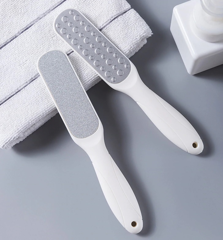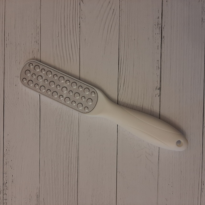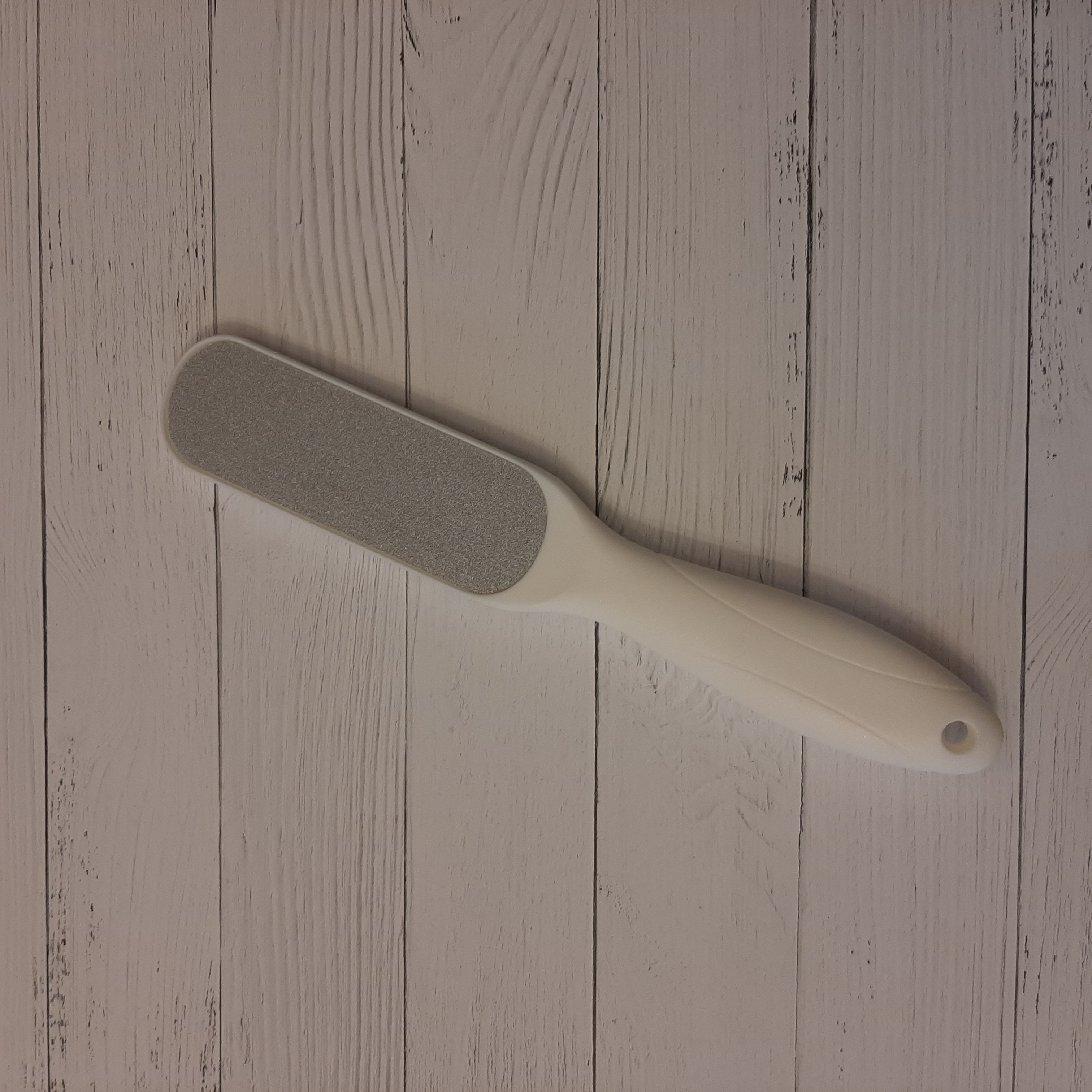 Двусторонняя педикюрная тёрка (рашпиль) с крупнозернистой и мелкозернистой поверхностью для мягкого и основательного удаления ороговевшей кожи. Нескользящая ручка и удобная форма позволяют легко удалять мозоли в труднодоступных местах.