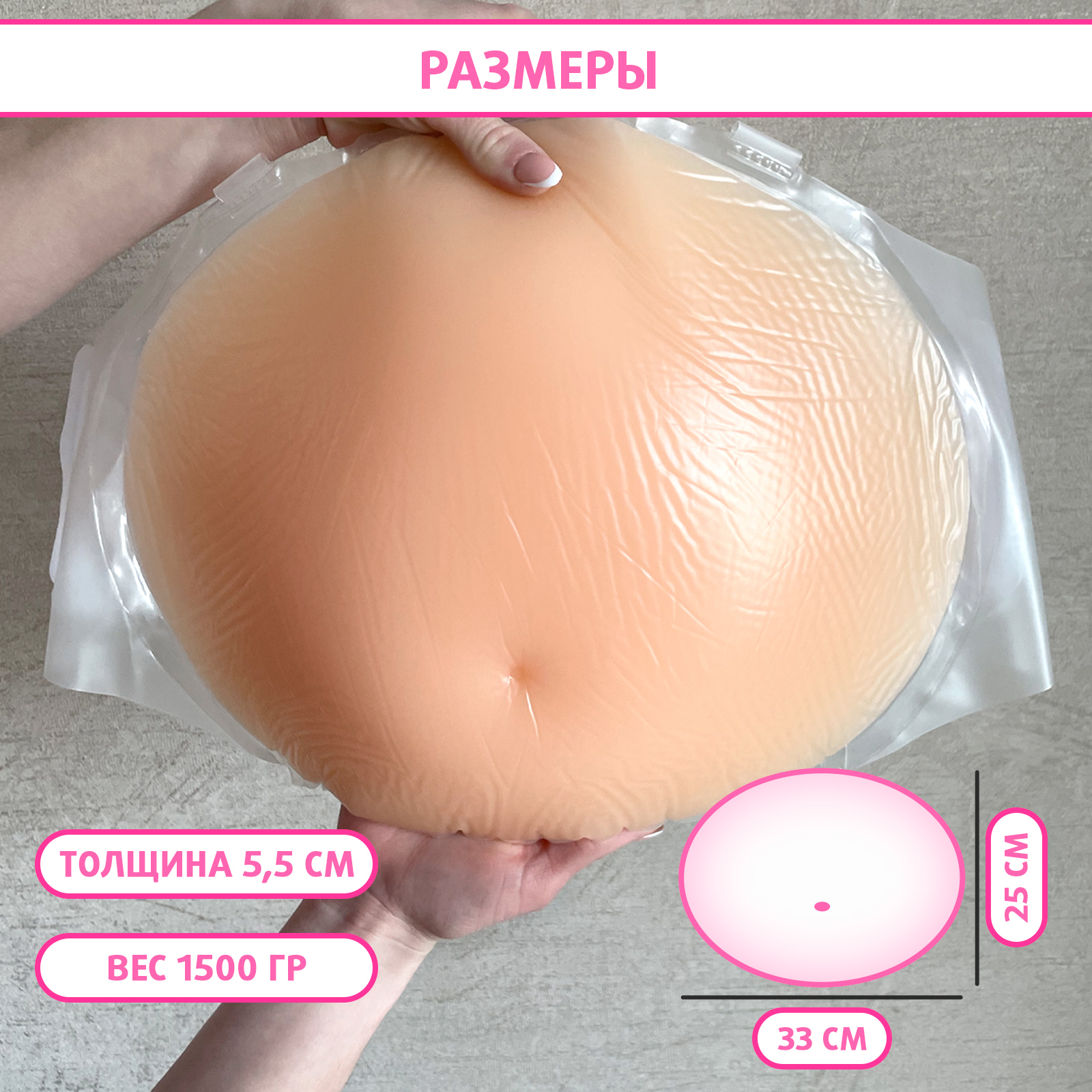 Накладной живот из силикона для имитации беременности на средних сроках беременности. Он имеет стандартное тройное крепление - клеевой слой/бандаж/бретели.